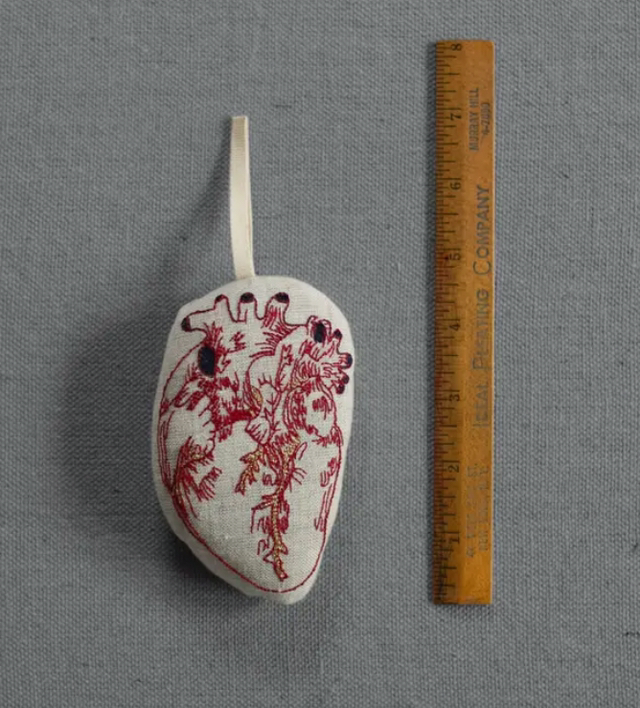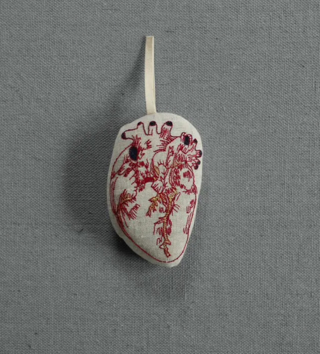 This anatomical heart token is machine embroidered in crimson red and black threads on natural colored mineral linen. Hand cut, turned and stuffed with a handful of lavender and organic cotton stuffing. Natural twill tape for hanging.