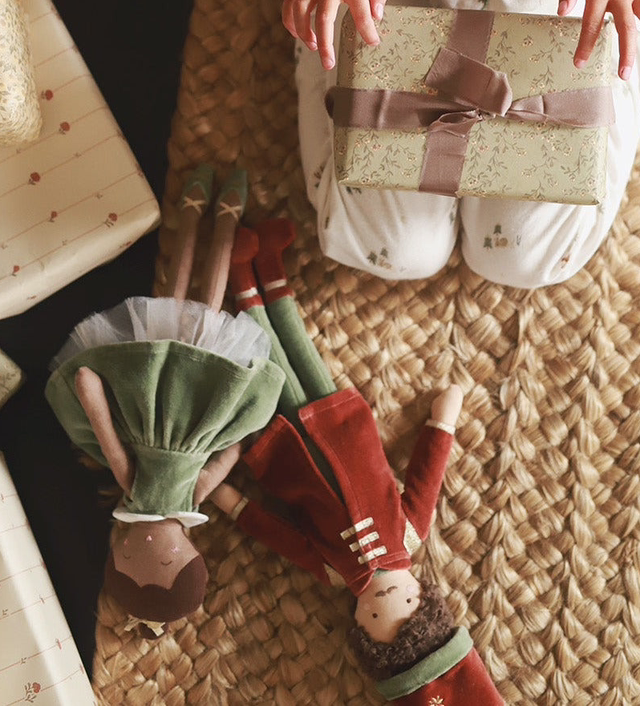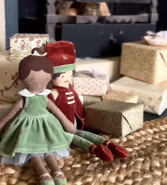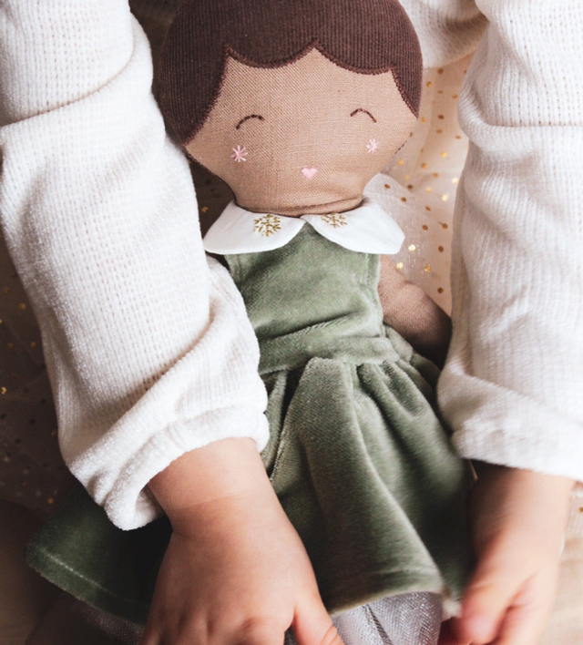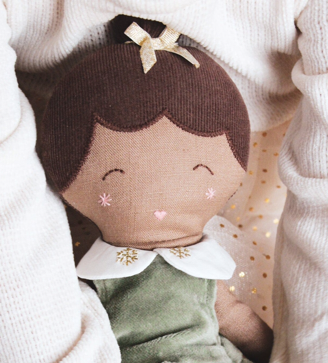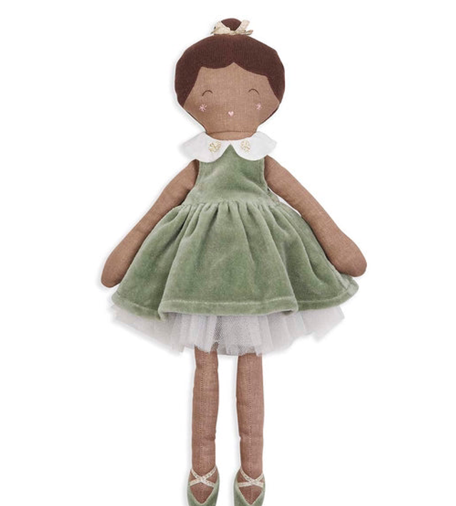 Meet your little one's new best friend, our Avery Row Ballerina doll. She boasts an impeccable ballerina bun artfully bound with a twinkling ribbon bow and an adorable heart-shaped smile. Her dress and ballerina shoes are made from luxurious organic cotton velvet and lined with a netted tutu. Her collar is elegantly decorated with glimmering gold snowflakes.