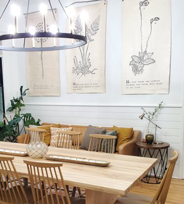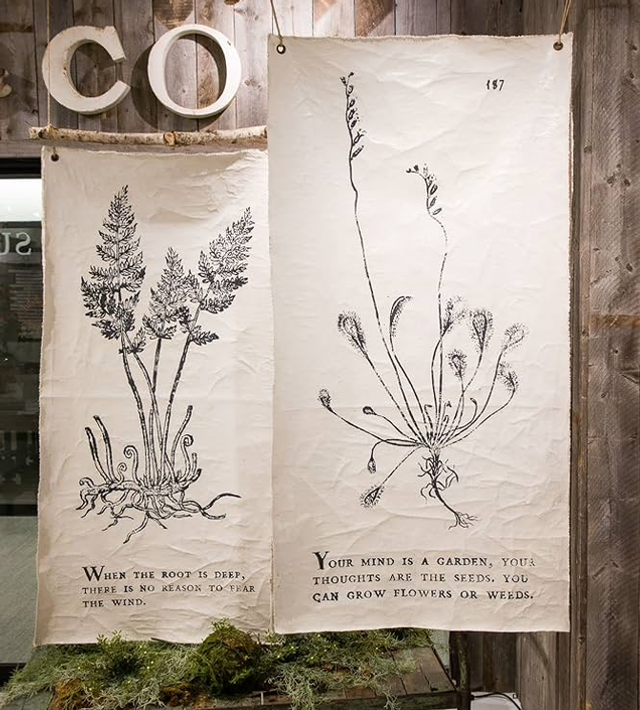 The handmade nature of these crackled tarps make them a casual relaxed way to introduce nature into a home while covering a lot of wall space. Each tarp comes with grommets at the top to use for hanging.