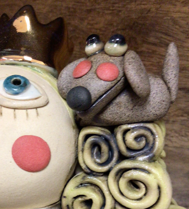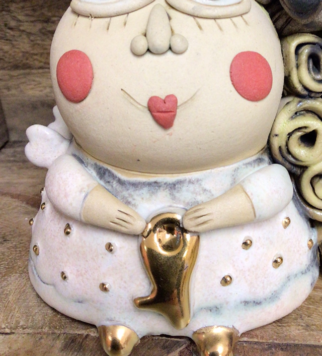 Handmade ceramic figurine angel with a shiny crown and matt white dress with gold lustre dots. Matt glazed face, wings, hair and dog. Approx. 8cm high