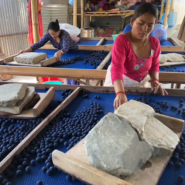 Handmade in a small workshop in the Kathmandu Valley, Nepal. The women makers all live locally and work flexible hours around family commitments. It can take 45 minutes to fully felt a tray of felt balls. The artisans fold wool fleece into small pods, then each works to roll a wooden board over a tray containing 600 pods plus a smidgen of water and soap. A rock is added for weight partway through the process, helping the balls become denser through friction whilst minimising soap and water consumption. The balls are dried en mass in the sun and then the artisans sit on the padded workshop floor, using their toes to keep the balls in place while hand-stitching and threading.