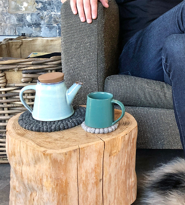 The tablemat is handstitched from felt balls; use it for your teapot, a plantpot mat or displaying your treasures.
