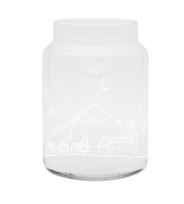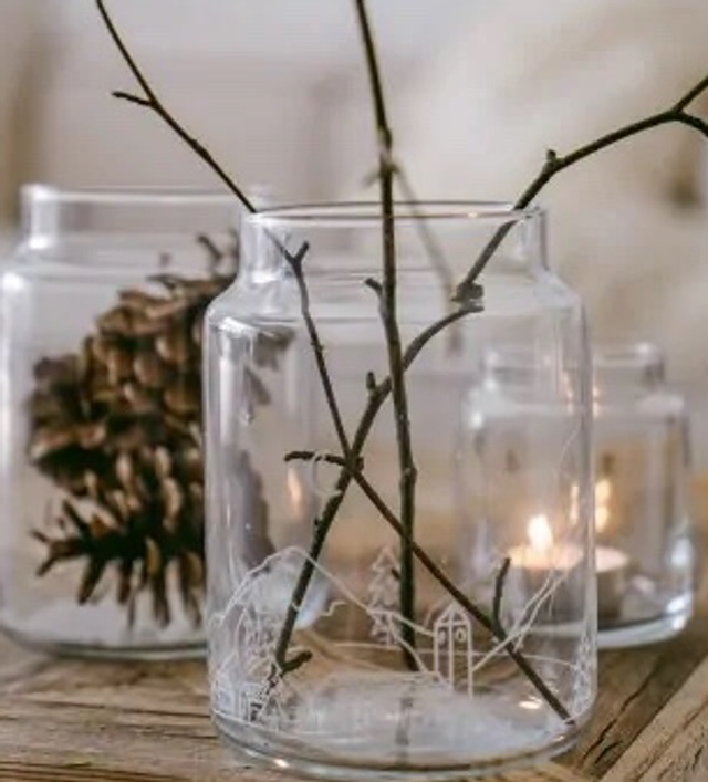 Discover the simple glass vase with beautiful snow landscape. Fill with pinecones or dried twigs for a rustic look.