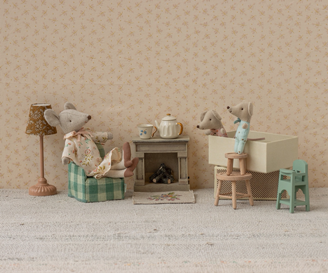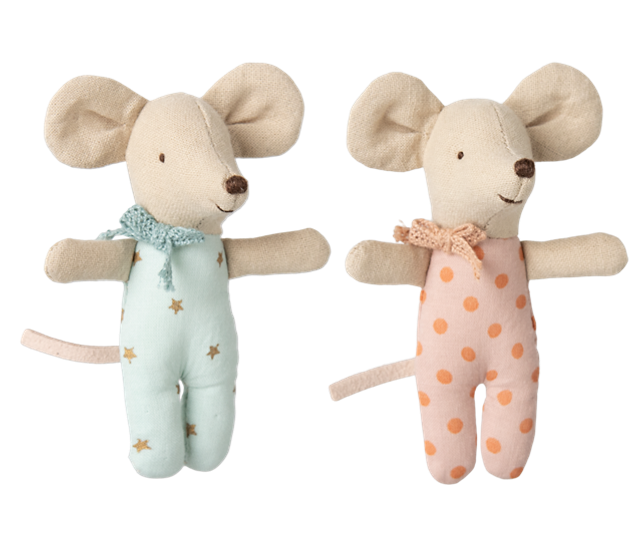 A classic Maileg item. These baby twin mice sleep safely in their sleeping bag side by side, tucked in the matchbox bed. The mice fit all accessories in size baby mouse.