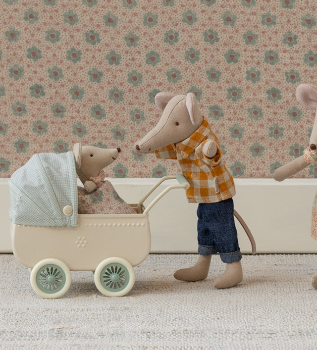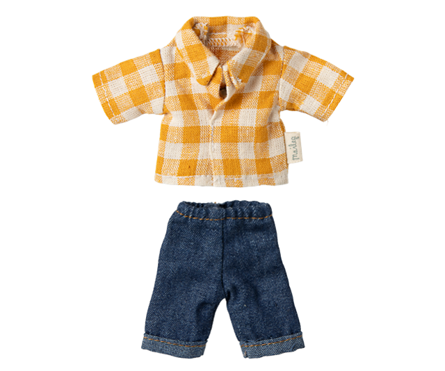 A classic Maileg item; Dad mouse in checked shirt and denim pants. This mouse fits furniture and accessories in size mouse. Buy more clothes separately. Clothes in size mum/dad fits this mouse.