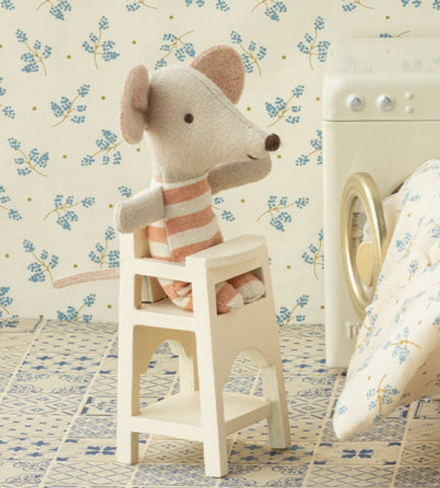 A classic Maileg accessory for baby mice. This high chair is a must have for all families with babies so the small one can participate in the meals.