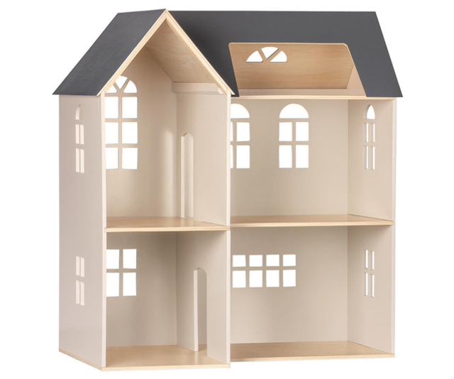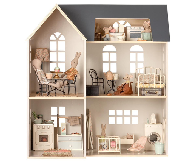 Maileg dollhouse with beautifully decorated walls. Products that fit into the house: Bunny/Rabbit size 1, 2, micro, my, Teddy family and furniture and accessories in size miniature