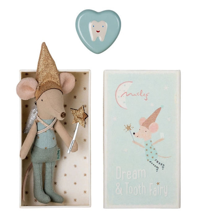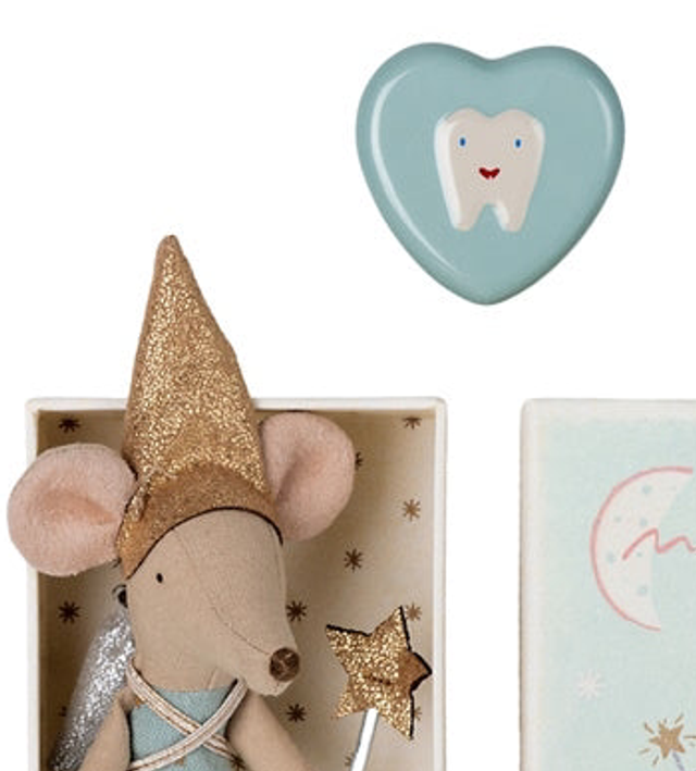At night the tooth fairy spreads fairy dust, collects teeth, brings treats, and whilst you have sweet dreams. Dressed in soft blue tones and with a shiny hat and a sparkly backpack, our friend also has a tooth box to collect that previous tooth in, and a matchbox to rest when not working!
