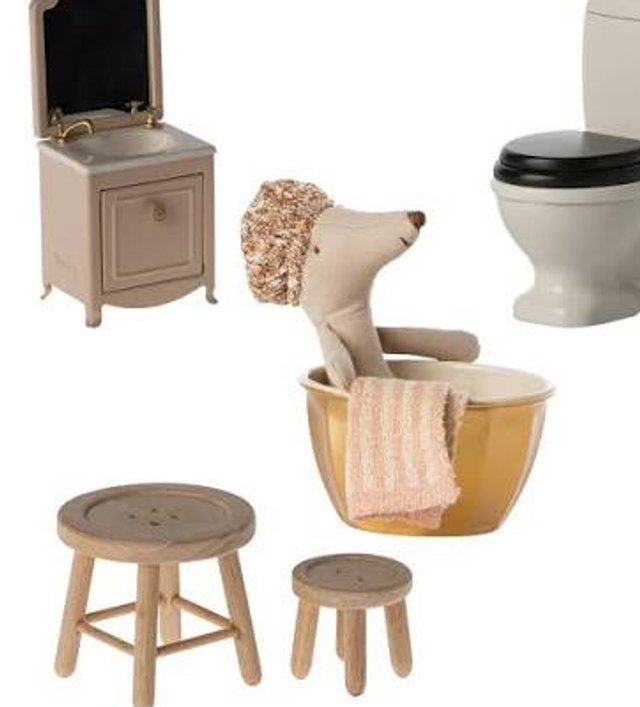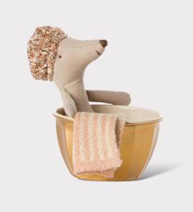 Like everyone else, this Maileg mouse loves to spend hours in the warm water in the spa set. This playset contains a golden bathtub, a mouse, and a towel and is perfect for endless imaginative play for your little one.