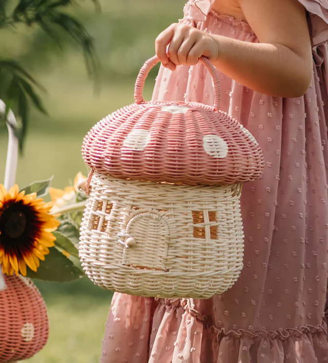 Meet our pink Mushroom Basket - a most lovely home for little woodland folk and designed for adventures and play. Use it as a carry bag or a decorative basket.
