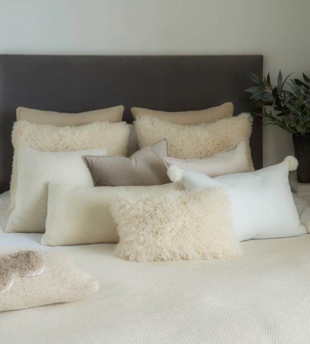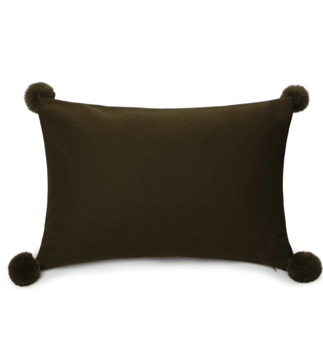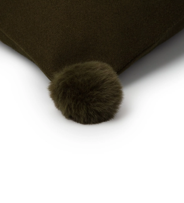A lovely soft cushion with a fur pompom in each corner. Available in white or dark olive. Team up with other textured and tactile cushions for a sumptuous, cosy look.