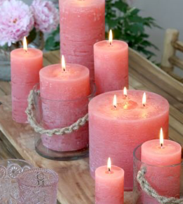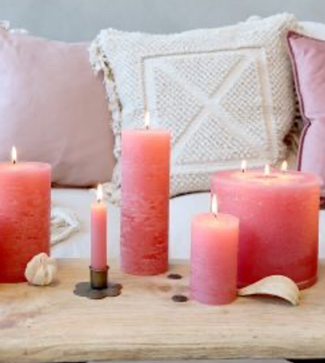 Unscented pillar candle with a rustic finish in the cheerful raspberry hue.
