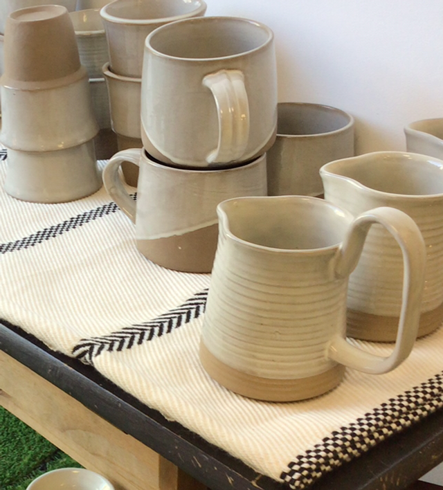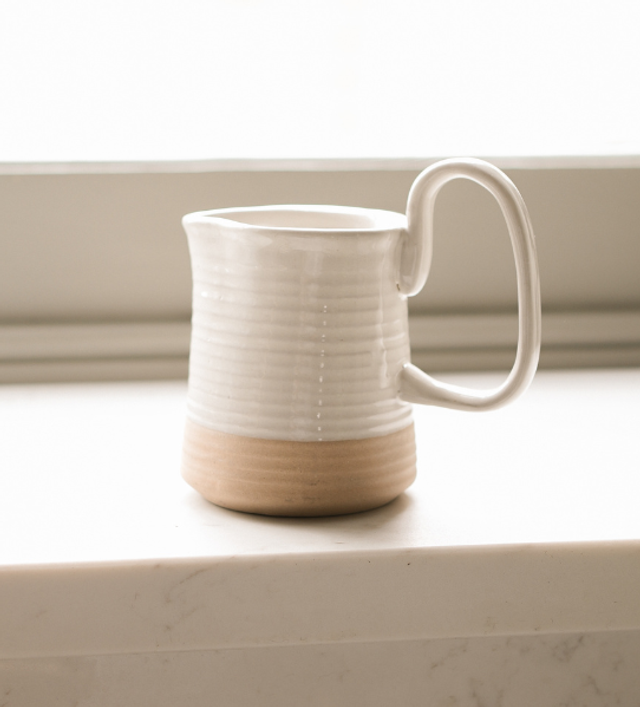 A beautiful little jug with a large handle. Our glazes are hand dipped so the finish will be uneven...these are not machine made! Depending on the batch and position in the kiln, the colour will vary slightly in both the clay and the glaze. These things are intentional and are the beauty of a truly handmade piece.