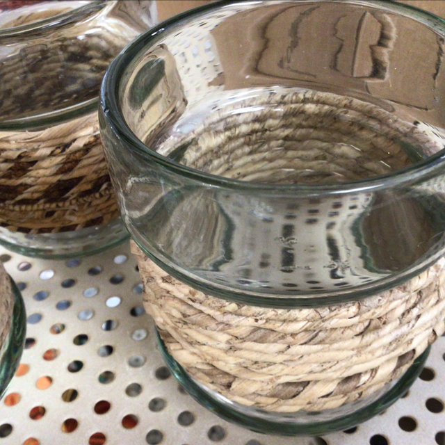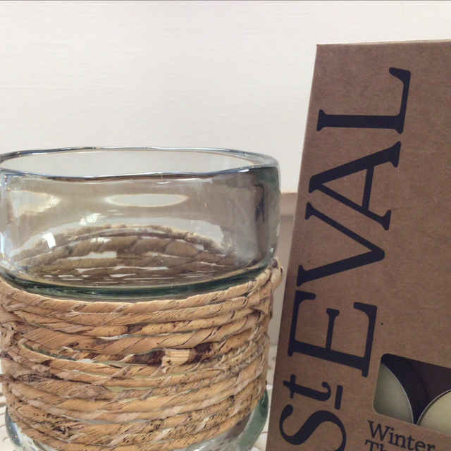 Thick glass tealight holder with wrapped raffia middle.