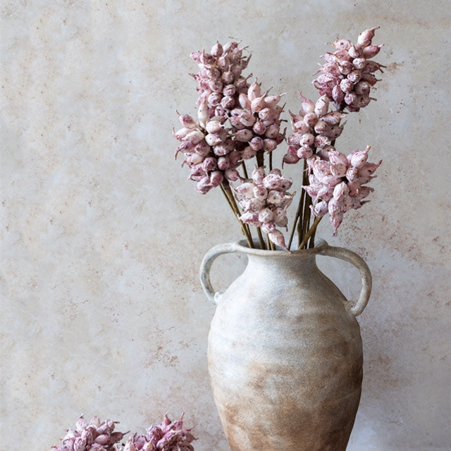 Pair it up with some tall faux foliage that is just as architecturally interesting as this thistle, to balance out its natural arching silhouette for a striking display in an oversized vase. Another tip is to contrast its spiky texture with some soft and delicate florals in a similar blush hued colour palette.
