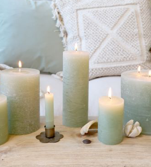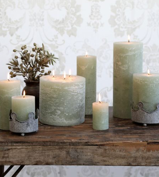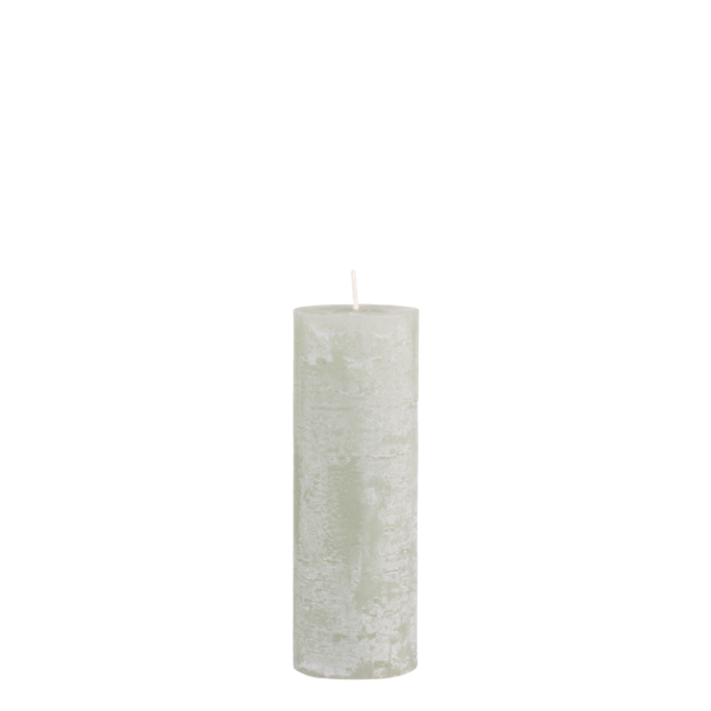 Unscented pillar candle with a rustic finish in a lovely green that whispers spring.